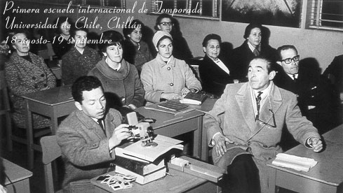Oreste Plath dicta clases en la Primera Escuela Internacional de Temporada, Universidad de Chile, Chillán, 1943.